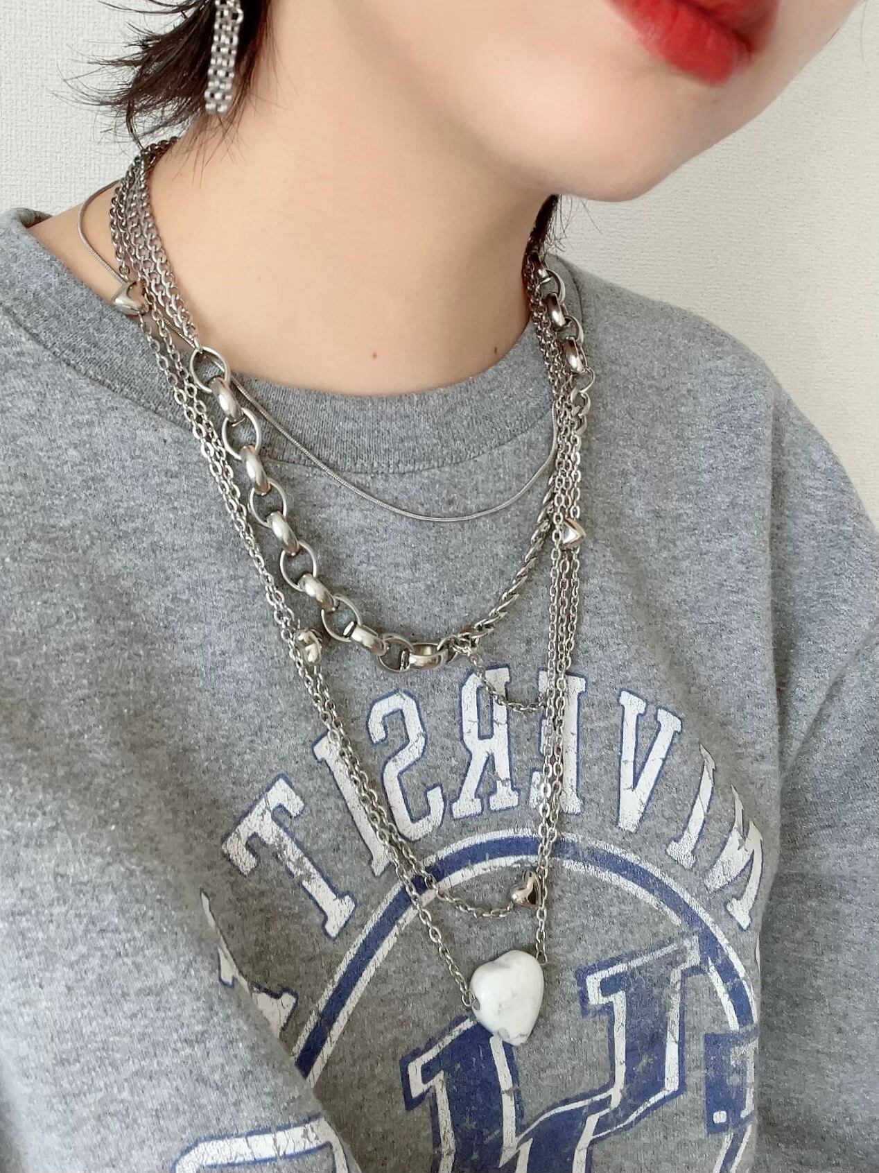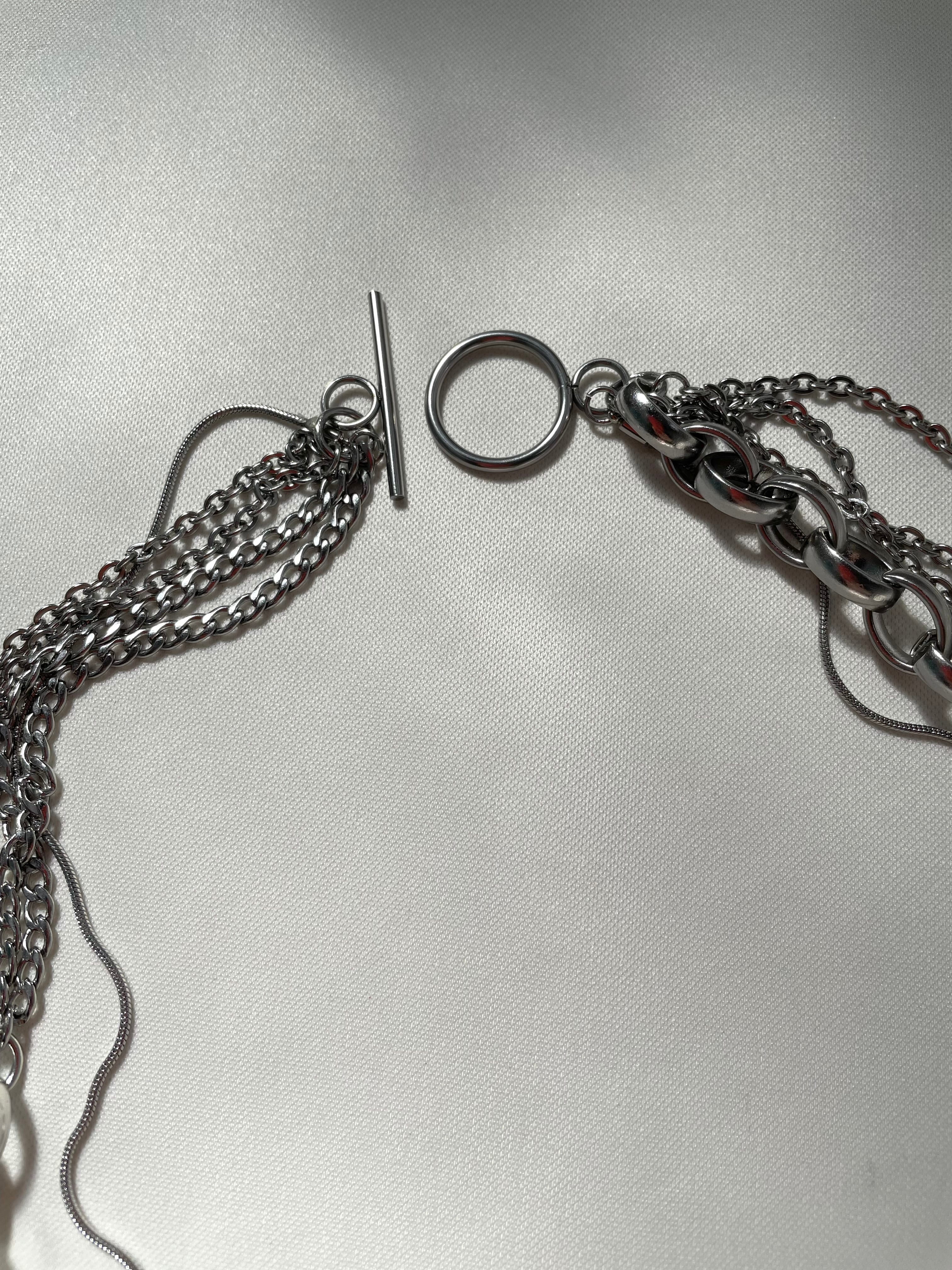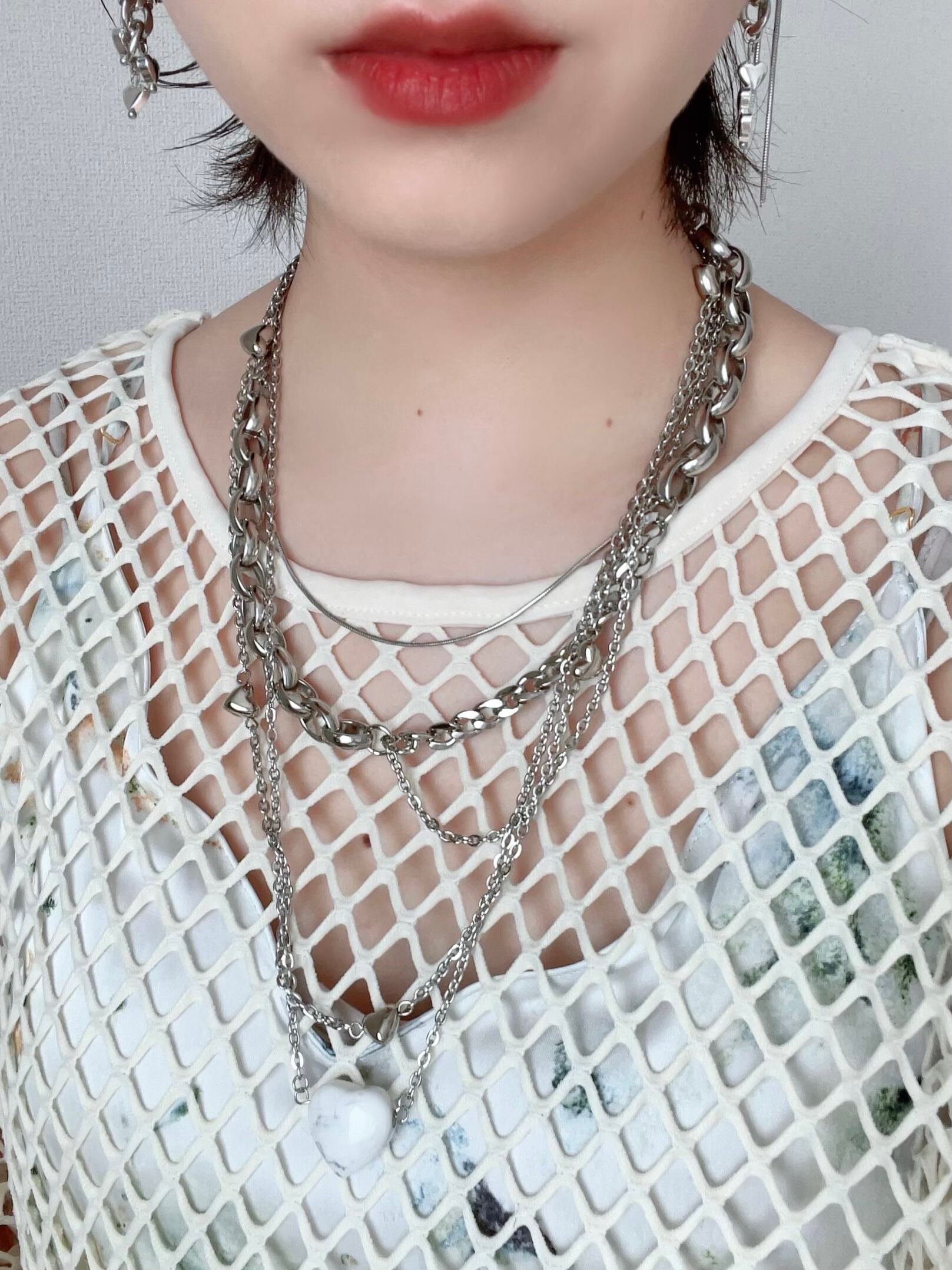 様々なチェーンを使用した重ね付け風のネックレスです。