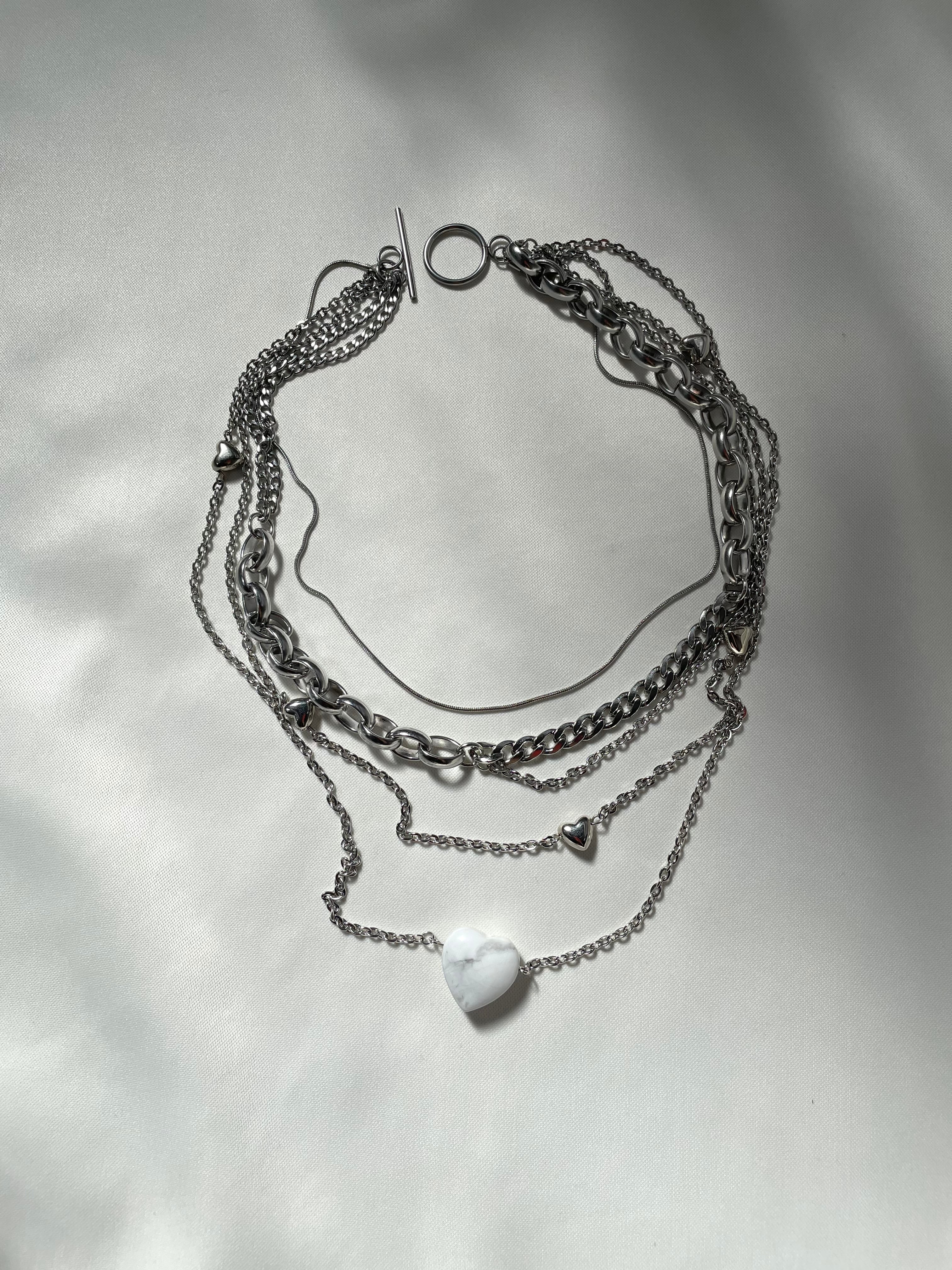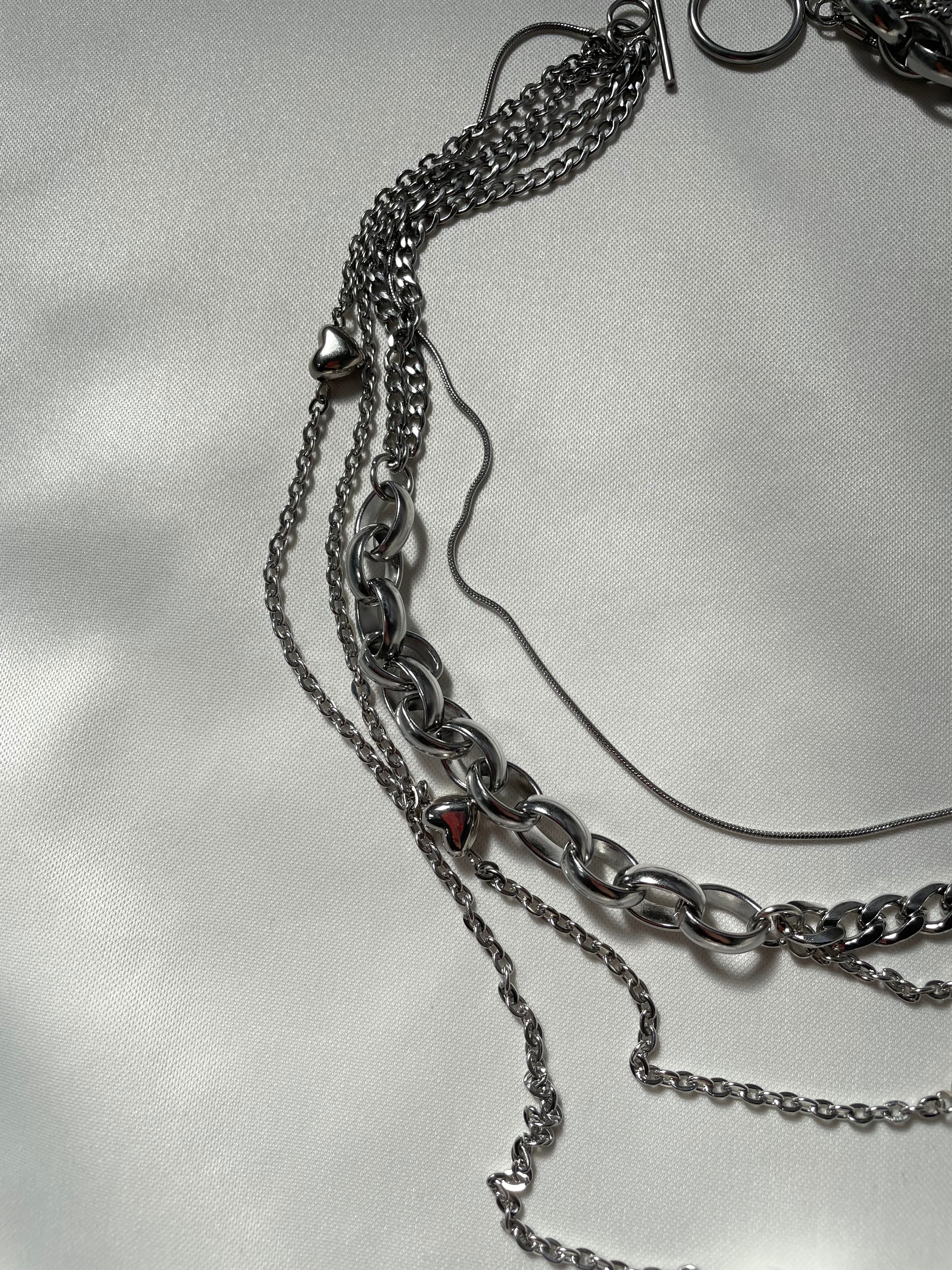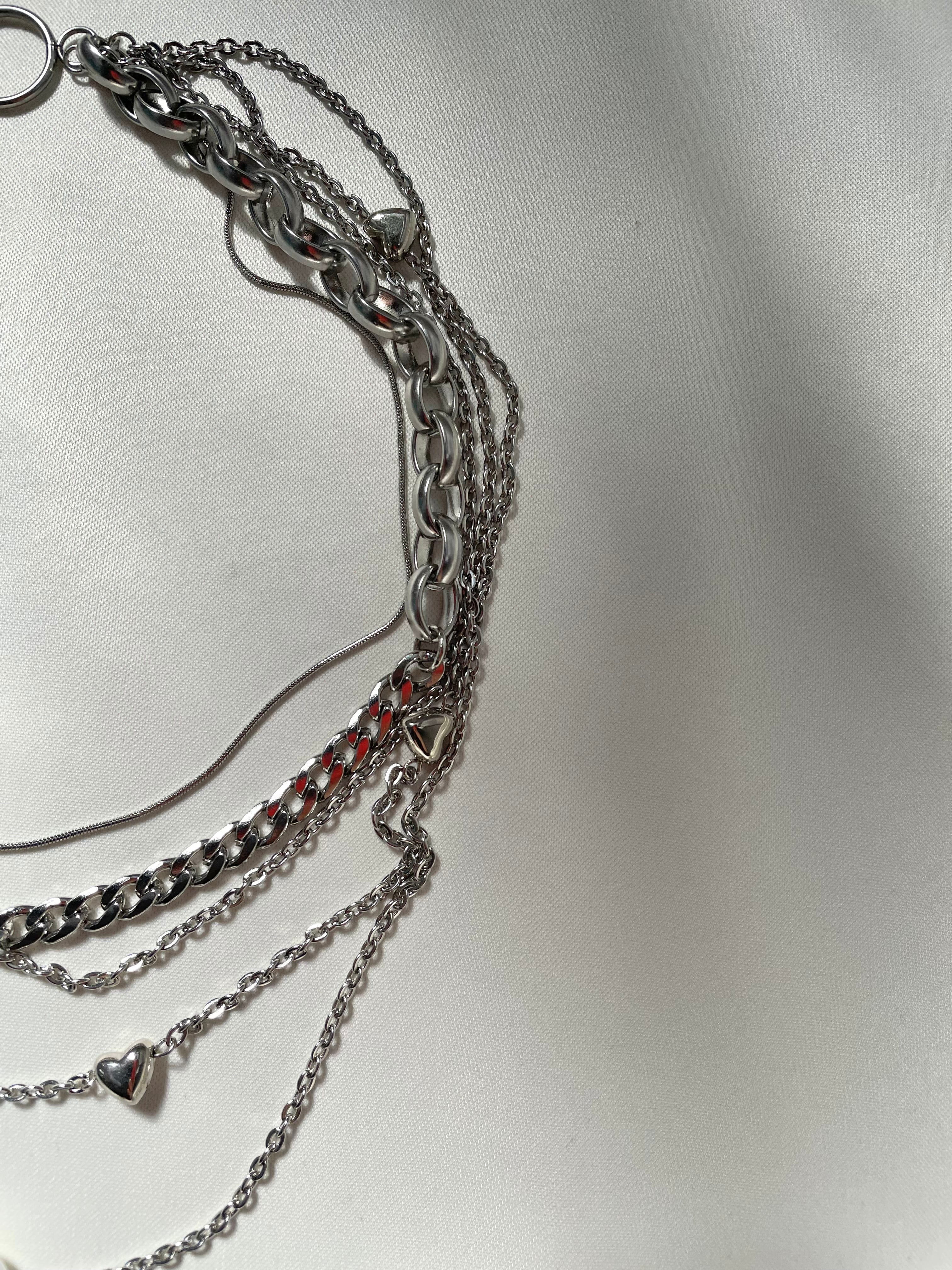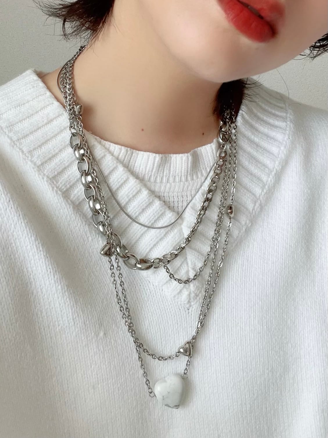 様々なチェーンを使用した重ね付け風のネックレスです。