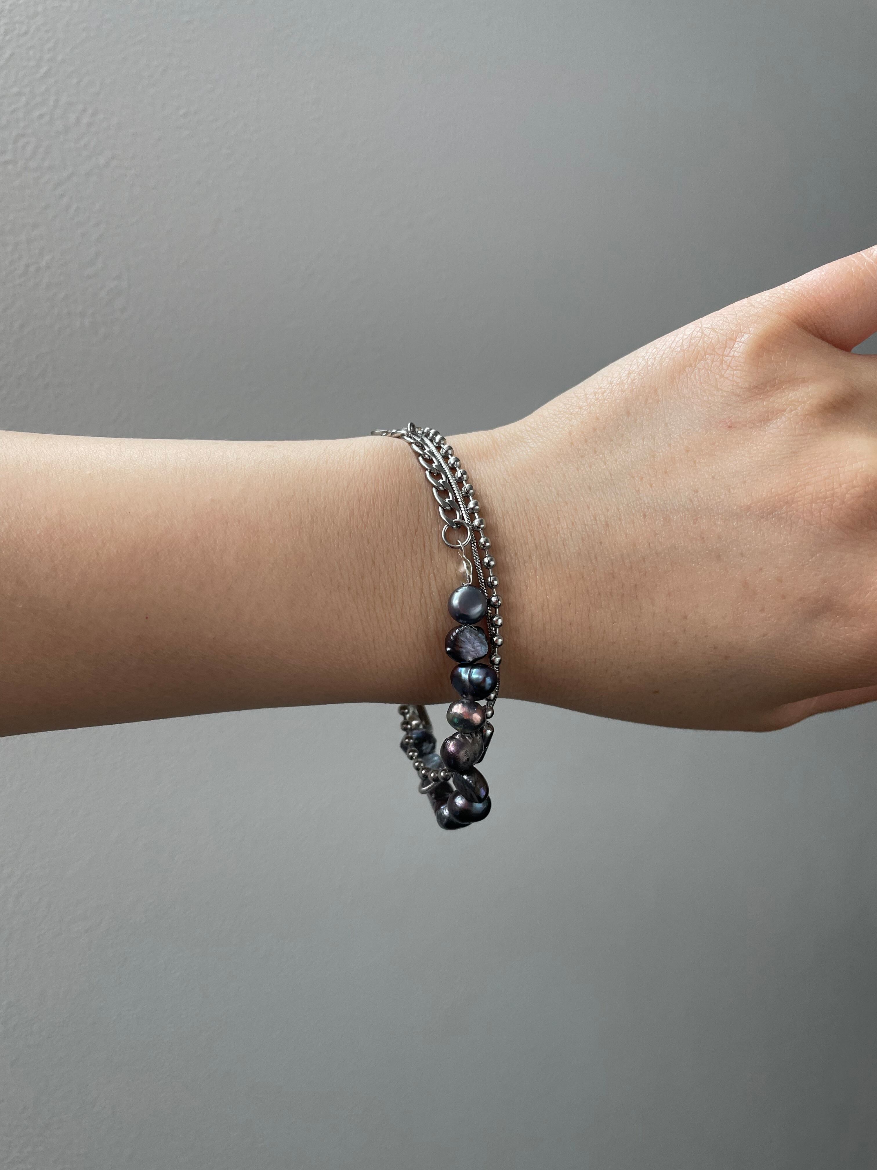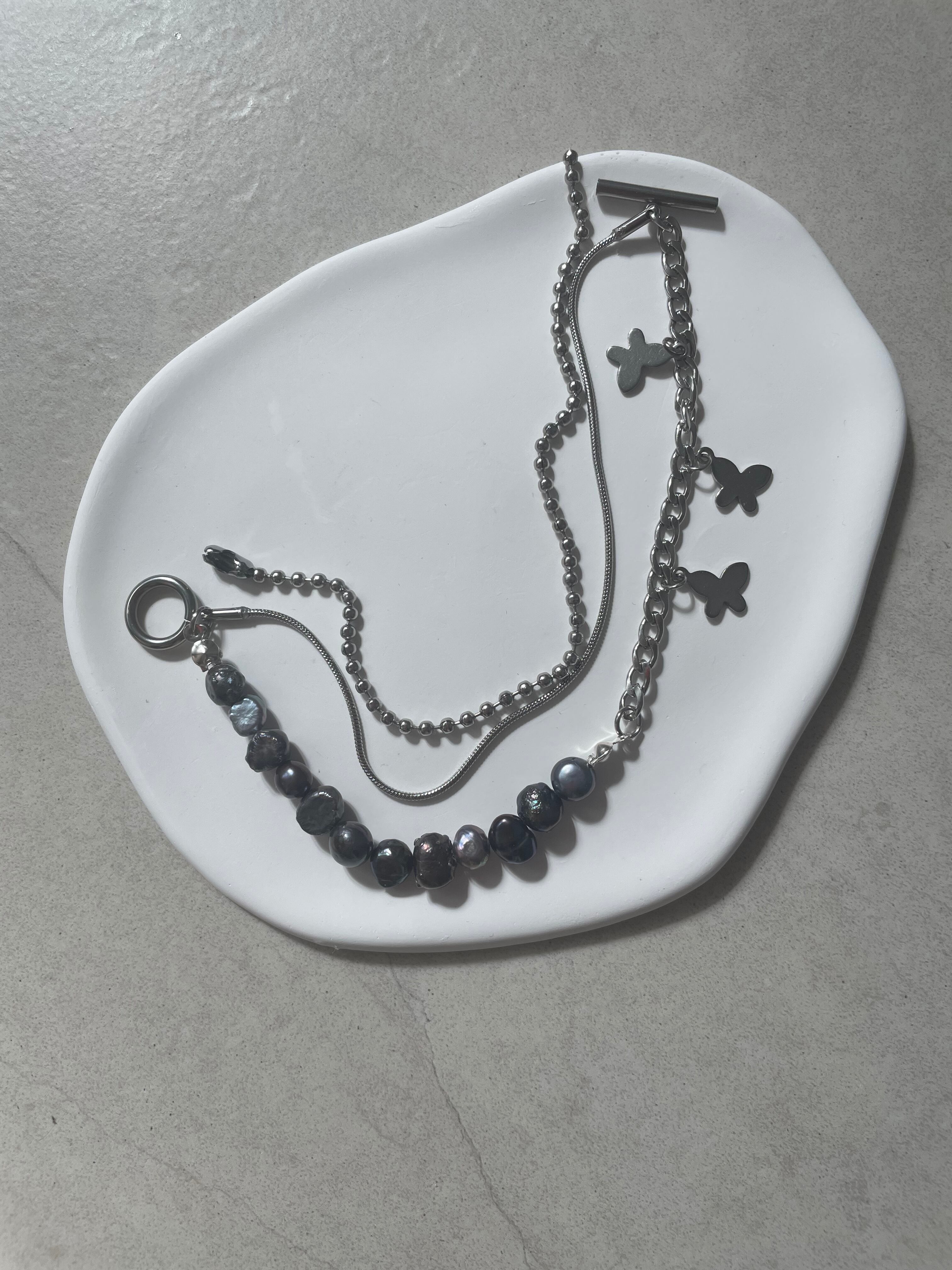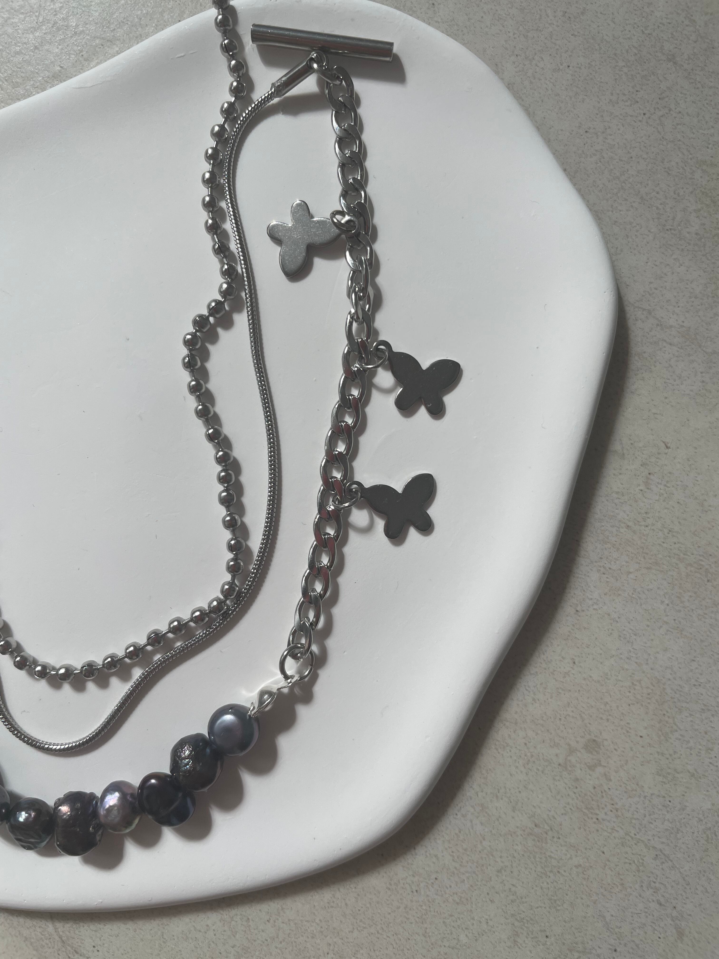 モードな雰囲気の黒のパールとさりげないバタフライのチャーム
