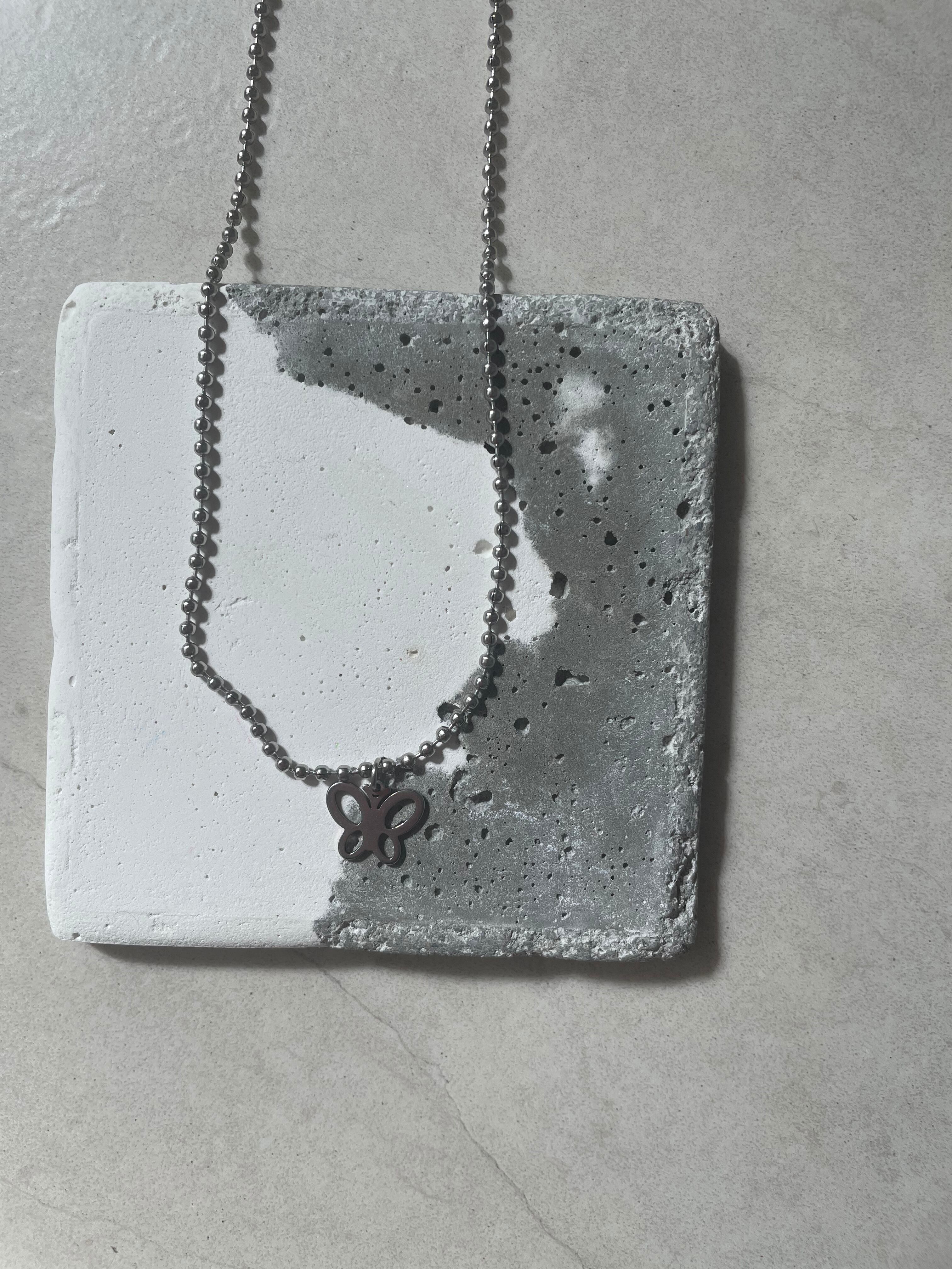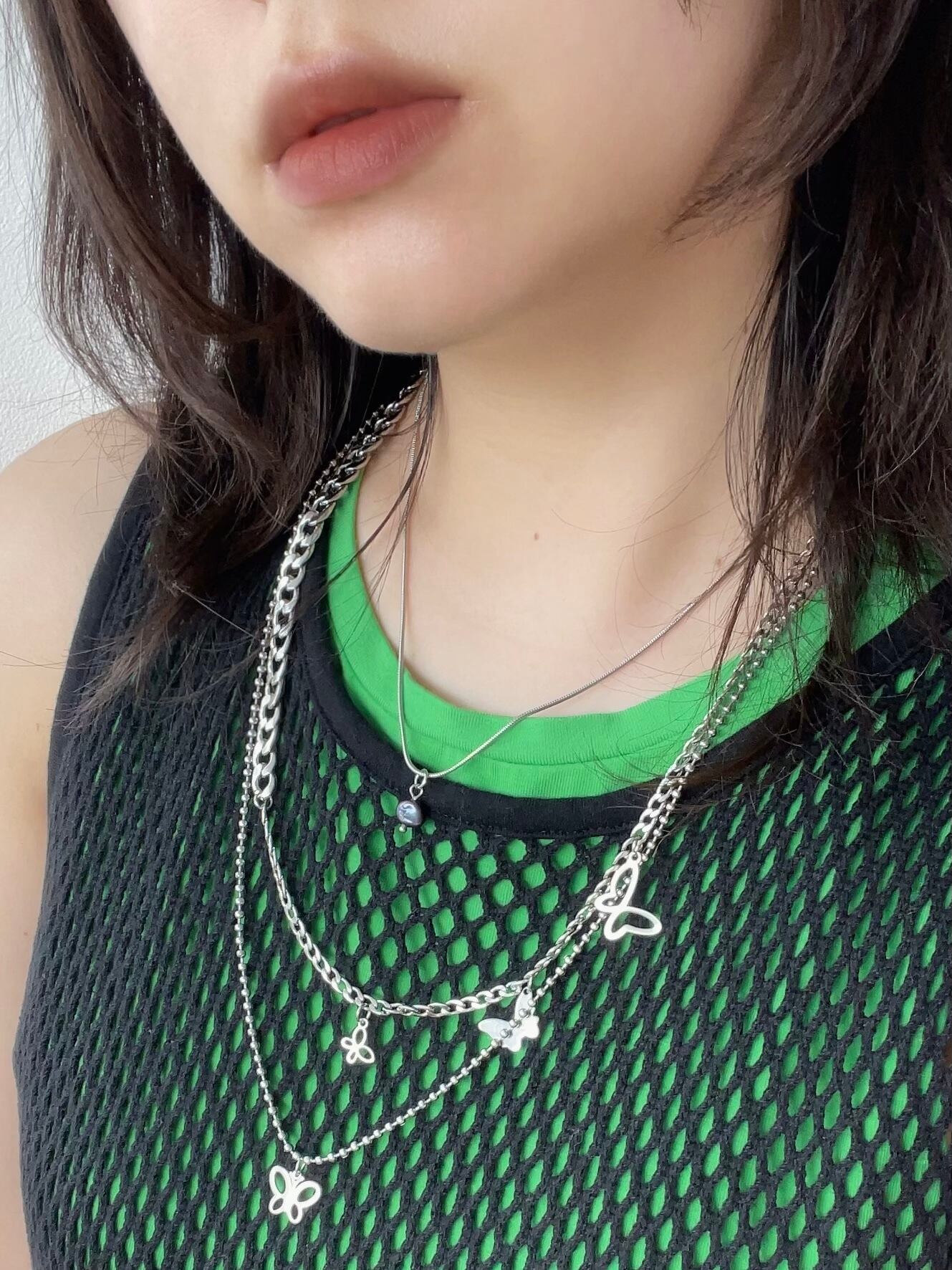 さりげなくある一粒のパール×様々なシルエットのバタフライが目を惹くネックレス